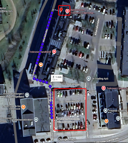 Der er 2 timers parkering på parkeringspladsen ved 365 Discount. Herfra er der ca. 2 minutters gang/200 m hen til klinikkens hovedindgang